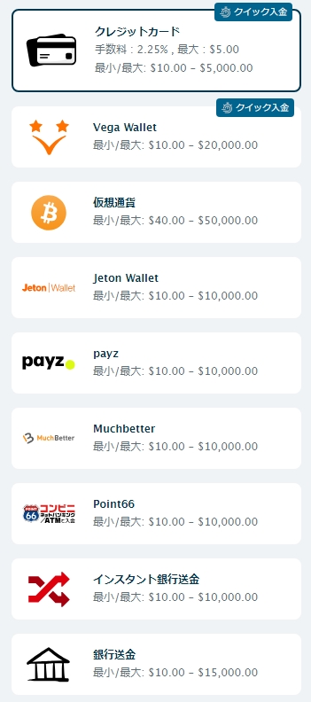 ベラジョンカジノは、様々な入金方法の取り扱いがあるので、入金額や手数料などを考慮して、使いやすい方法を選べます。