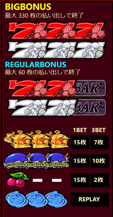 通常ゲーム→ローズチャレンジ→レギュラーボーナス→ビッグボーナス→連チャンモード、と段階的にレベルアップしていきます。